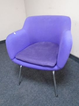 A set of six armchairs on metal legs upholstered in purple fabric designed by Robin Day for Hille