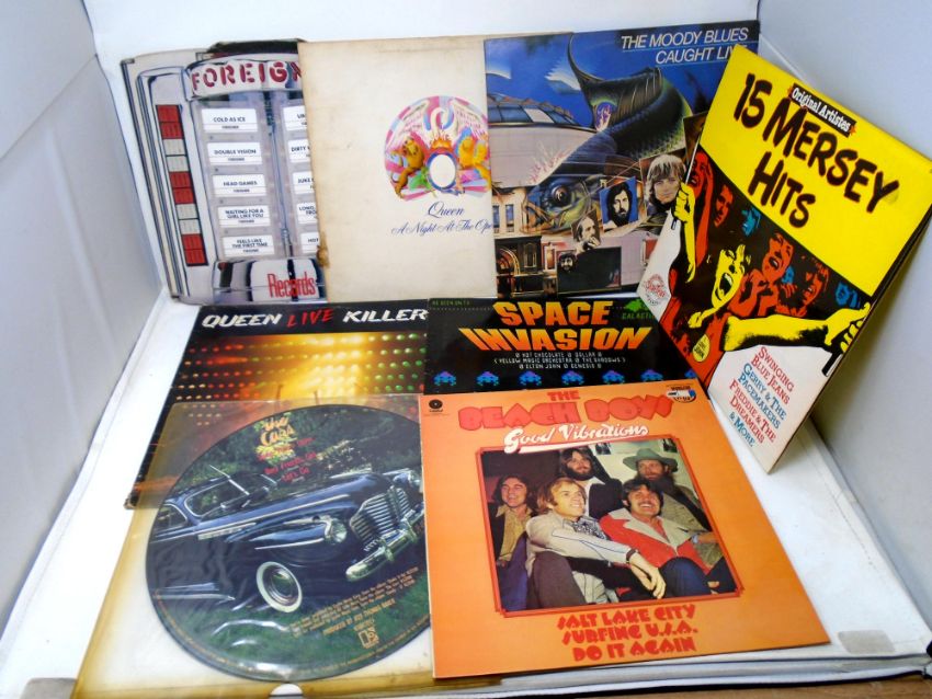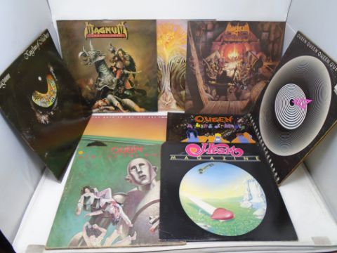 A box containing approximately 38 LPs including Moody Blues, Queen, Magnum, Bill Wyman, Marillion, The Shadows, compilations etc.