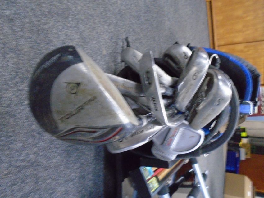 A Wilson golf bag containing irons and a Dunlop driver together with an LCD TV (AF), a chin up bar and a two-piece Riley snooker cue in case.