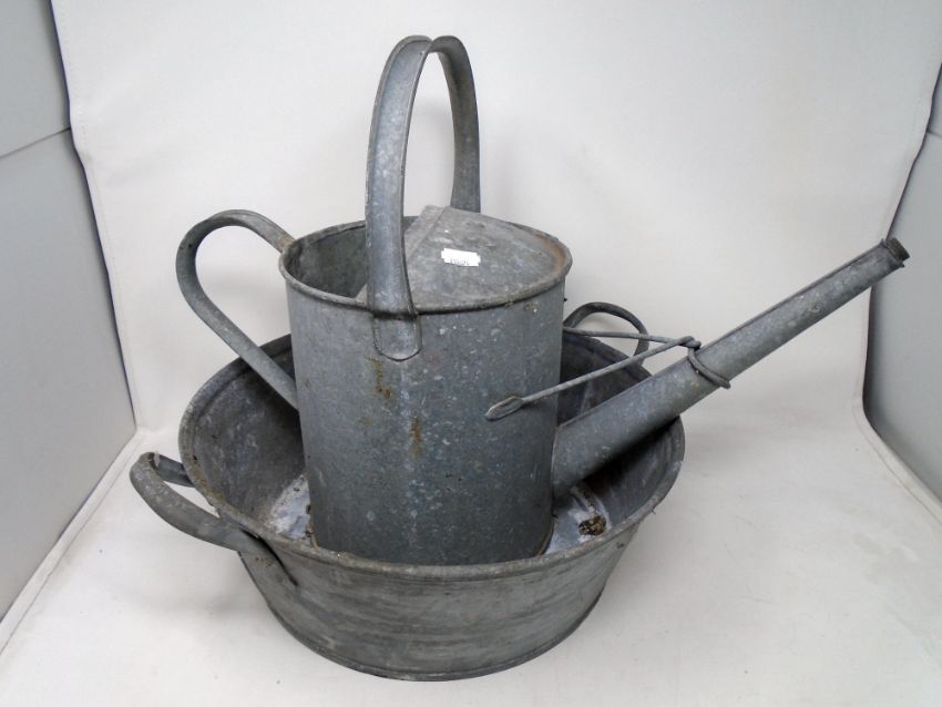 A galvanized twin-handled tub together with a galvanized watering can.