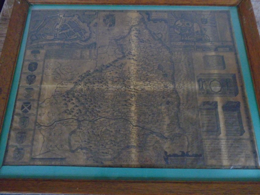 A framed antiquarian map on paper of Northumberland together with a further map of the Kingdom of Ireland and a limited edition print of Bamburgh after M Forster
