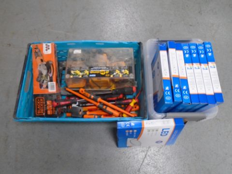 A plastic crate containing a Black & Decker angle grinder, a quantity of assorted screwdrivers, a 4-in-1 power sharpener and five further plastic storage boxes containing LED ceiling lights.