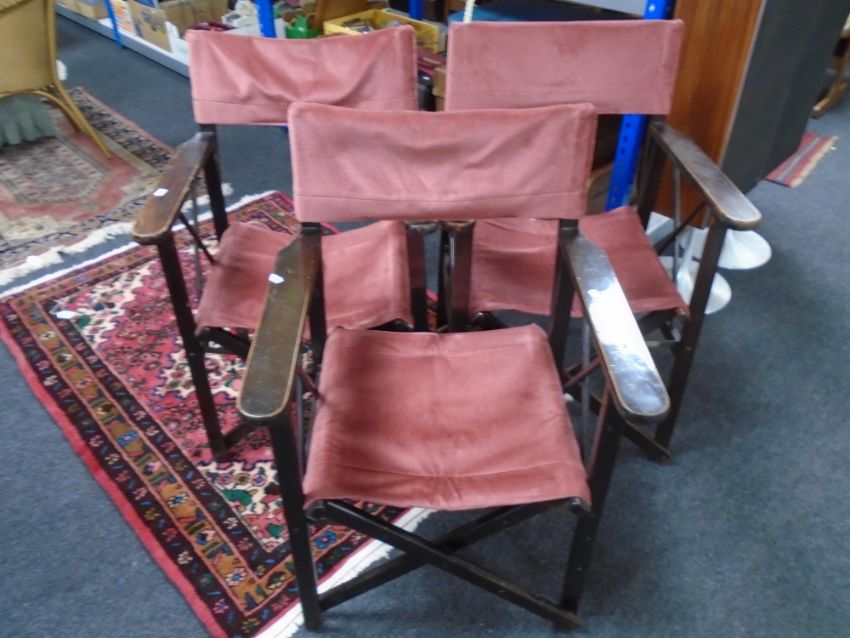 A set of three stained pine director's chairs