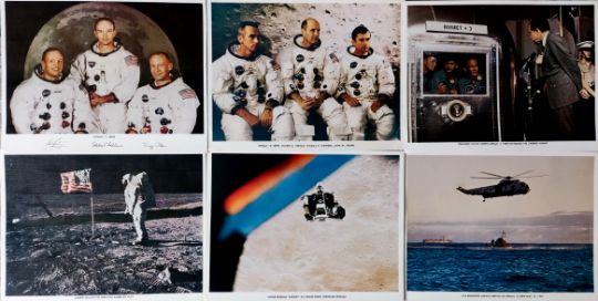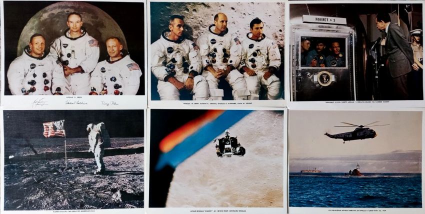 Vintage collection of NASA lithographs of Buzz Aldrin on the Moon, A group shot of Armstrong, Aldrin and Collins, President Nixon greeting the Apollo 11 crew on board the carrier hornet and others.