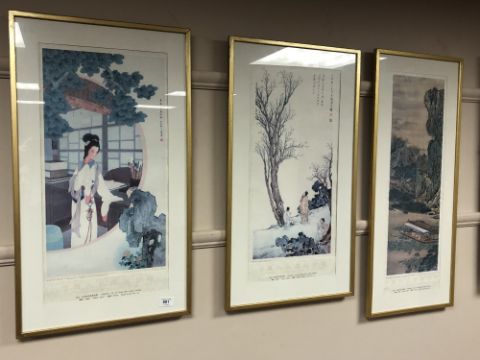 Three Chinese colour prints depicting figures and landscapes, two 41cm by 71cm and one 34cm by 80cm. (3)