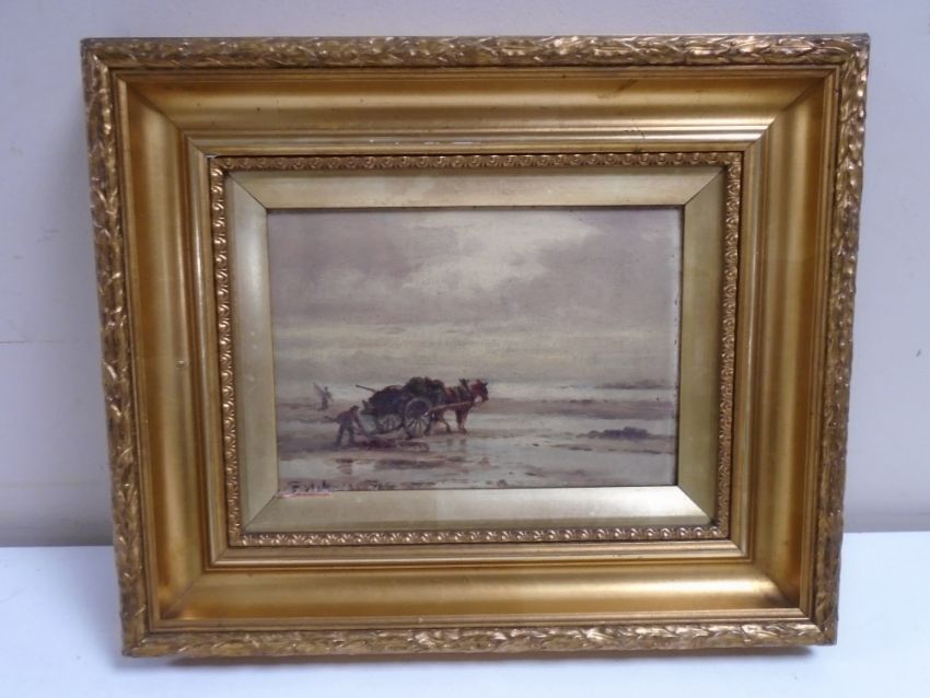 An early 20th century gilt framed oil-on-canvas depicting a figure with a horse and cart, indistinctly signed, 17cm by 12cm.