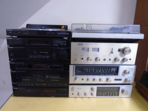 A Panasonic stereo system together with a Pioneer auto stereo turntable, a Sony integrated amplifier, a Pioneer tuner and further amplifier.