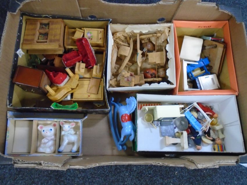 A hand-finished wooden doll's house, together with dolls house furniture and vintage accessories. (Q)