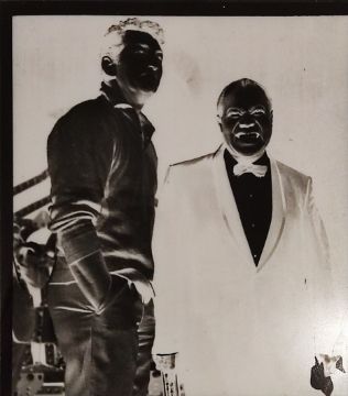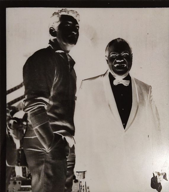 A negative of Dean Martin and Louis Armstrong on stage together with a photo of Charlie Chaplin in 'A dog's life'.