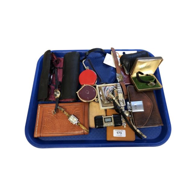 A tray of lady's purses, wristwatches, compacts, travel clock, manicure set etc