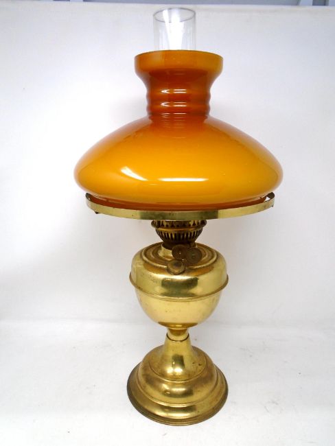 A 20th century brass oil lamp with glass shade.