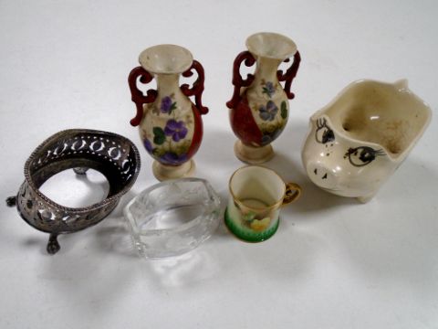 A Royal Worcester miniature gilded mug decorated with rose sprays, together with crystal napkin ring, pottery items etc
