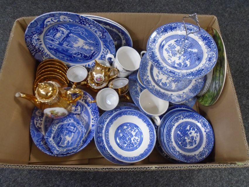 A box of blue and white china, Spode Italian plate, gilt coffee set etc.