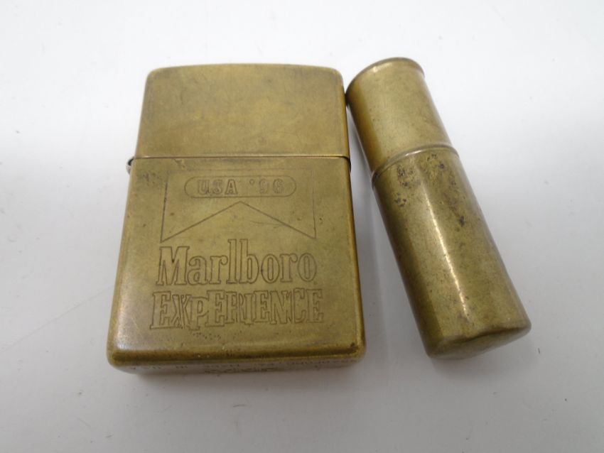 A brass trench art lighter together with a further brass Zippo Marlboro lighter.