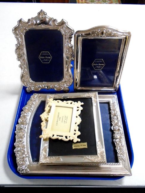 A tray of silver plated photograph frames and a Laura Ashley frame.