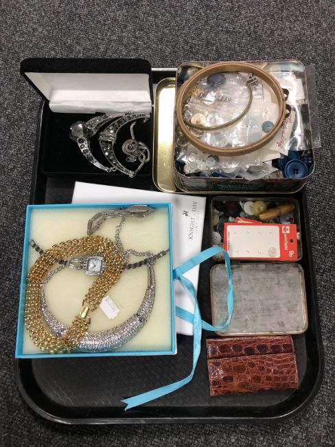 A tray containing tins containing buttons, a leather wallet, lady's wristwatches, costume necklaces.