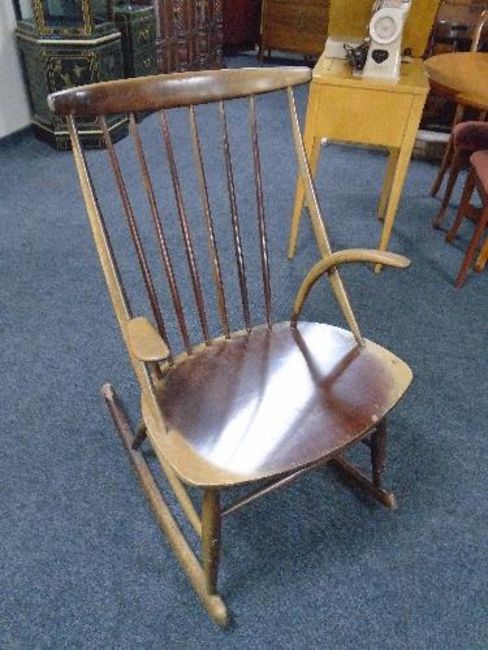 A mid century beechwood stick back rocking chair