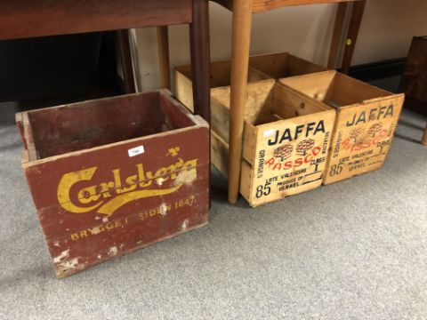 A painted Carlsberg brewery crate together with two further pine Jaffa crates.