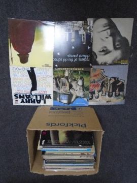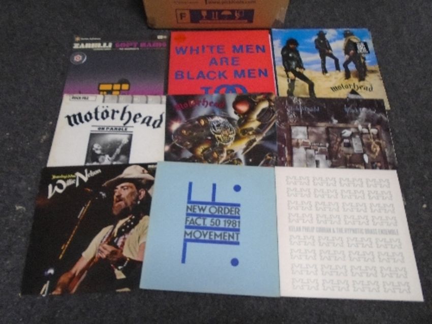 A box containing vinyl records including Motorhead, Wishbone Ash, New Order, Lou Reed, Tindersticks, Willie Nelson, Randy Newman, Hank Williams etc.