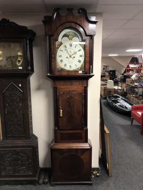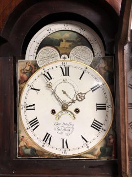 A 19th century inlaid mahogany longcase clock, the painted dial signed Chas Massey of Shelton, brass finials, pendulum, weights and keys.