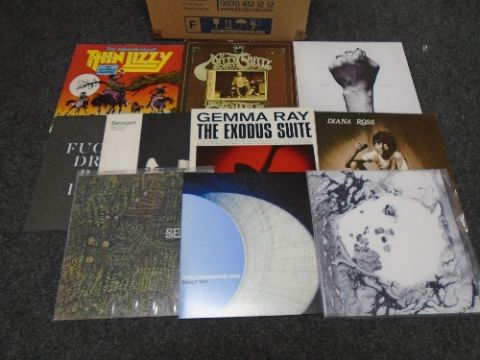 A box containing vinyl records including Thin Lizzy, Diana Ross, Radiohead, Megadeth, Sleaford Mods, easy listening etc.