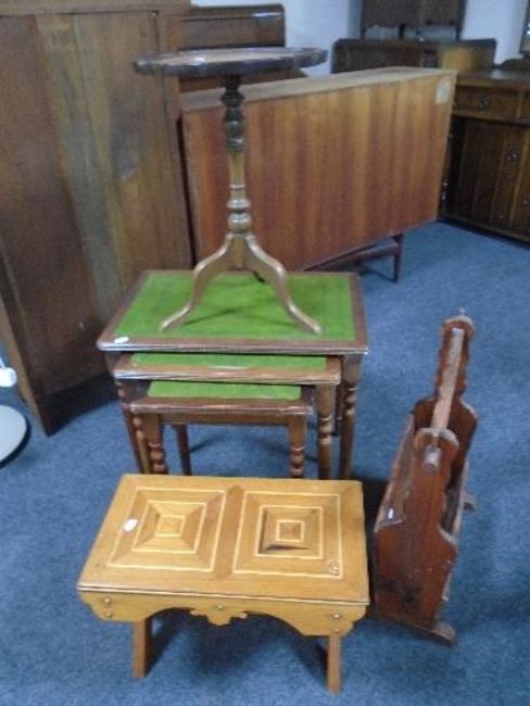 A nest of three tables with leather inset panels together with a further wine table, a pine cracket and a rustic pine magazine rack.
