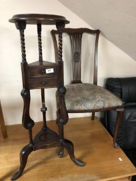 A Victorian style wig stand fitted with drawers together with a 19th century mahogany chair on cabriole legs.