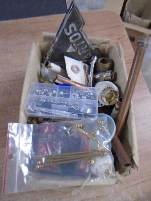 Two boxes containing a large quantity of antique and contemporary door locks, door handles, copper pipe, fittings, radiator valves etc.