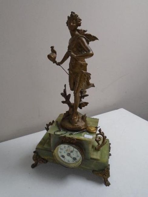 An antique French onyx mantel clock surmounted by a figure Chasse Aux Papillons Par Ferrand, with painted dial, pendulum and key.