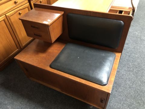 A mid-20th century teak telephone table with black vinyl seat.