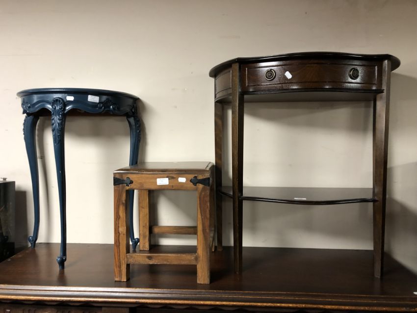 A regency style two tier serpentine fronted hall table together with a sheesham wood stool and a further painted hall table.