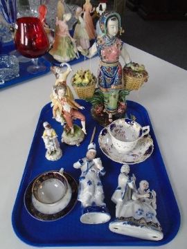 A tray of continental figures, two tea cups and saucers, Capodimonte figure