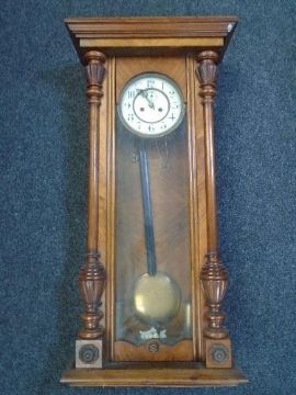 A Victorian walnut cased wall clock with pendulum and two weights.