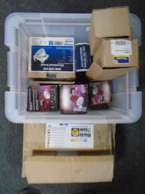 A crate of LED lights, bulk head lights, spot lights etc