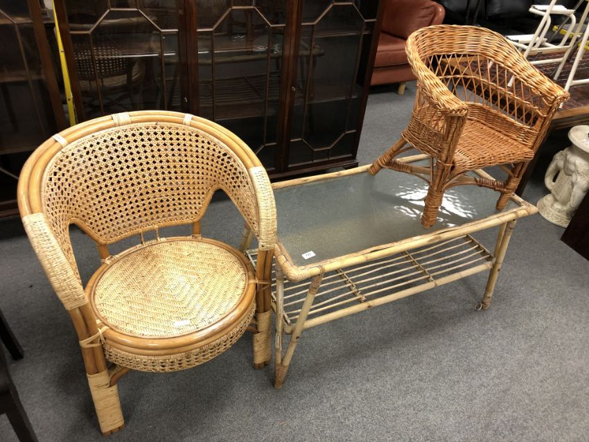 A bamboo and wicker armchair together with a child's wicker armchair and a bamboo and wicker glass top table.