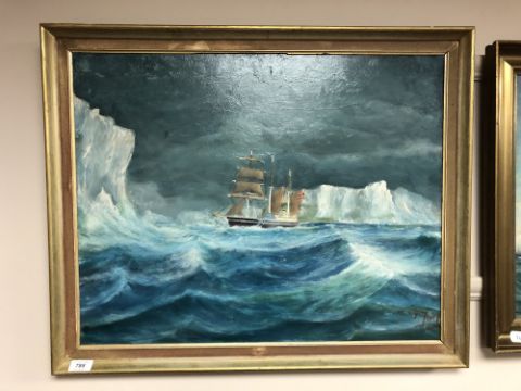 P. Joel : Ship in icy seas, oil-on-board, in gilt frame, 41cm by 65cm.