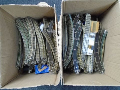 Two boxes containing vintage tin plate OO track.