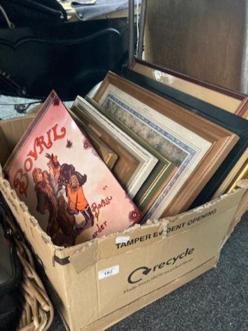 A box of pictures and prints, metal Bovril sign, Quaker Oats sign.