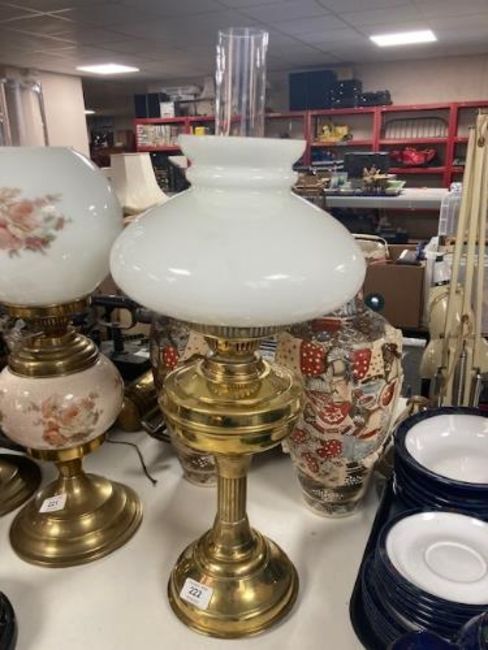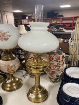 A brass oil lamp with white glass shade