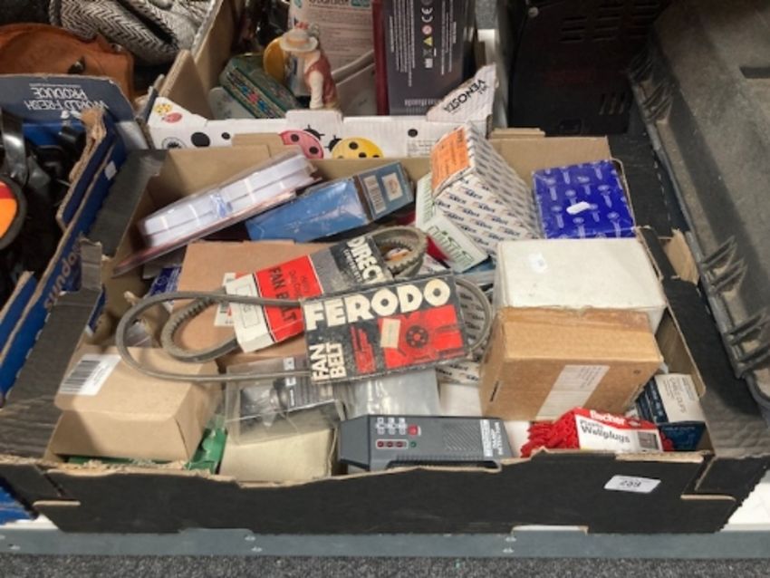 A tool box and box containing hardware, fan belts, wall plugs, screws etc