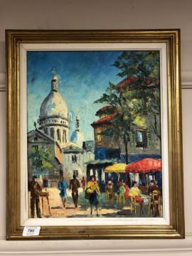 Continental school : Summer market with spire beyond, oil-on-canvas, in gilt frame and mount, indistinctly signed, 40cm by 30cm.