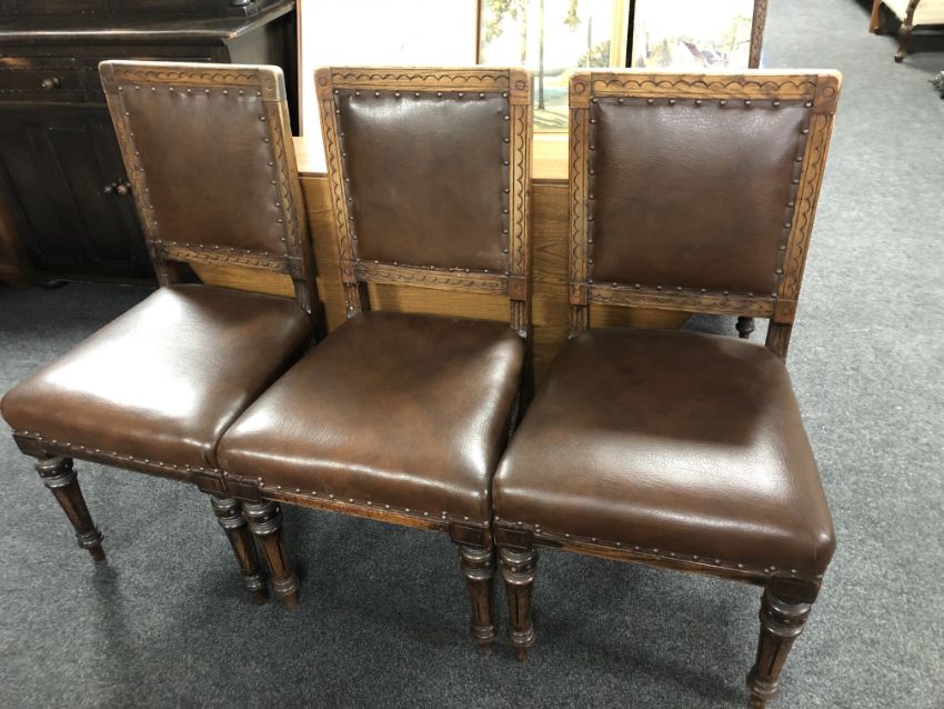 A set of six carved Edwardian oak dining chairs upholstered in brown studded leather.