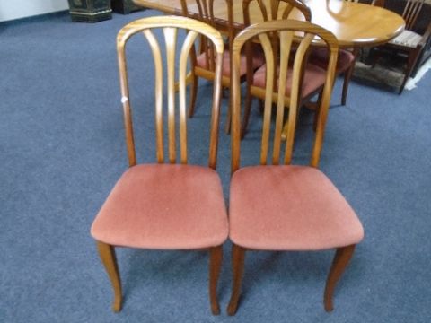 A Sutcliffe furniture oval teak extending dining table fitted with a leaf together with a matching set of six chairs.