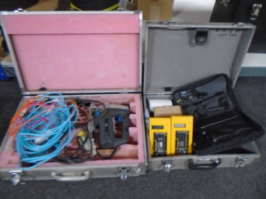 Two aluminium cases containing fibre optic Megger testers, wires, components, an Elu 110v jig saw etc.