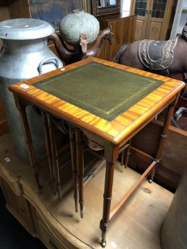 A nest of three good quality tables, one with inset leather panels.
