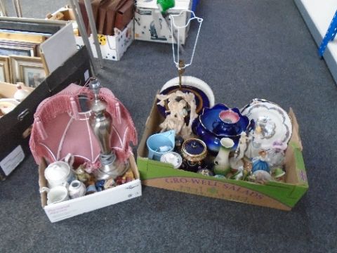 Two boxes of china figures, plates, ornaments, figured lamp etc