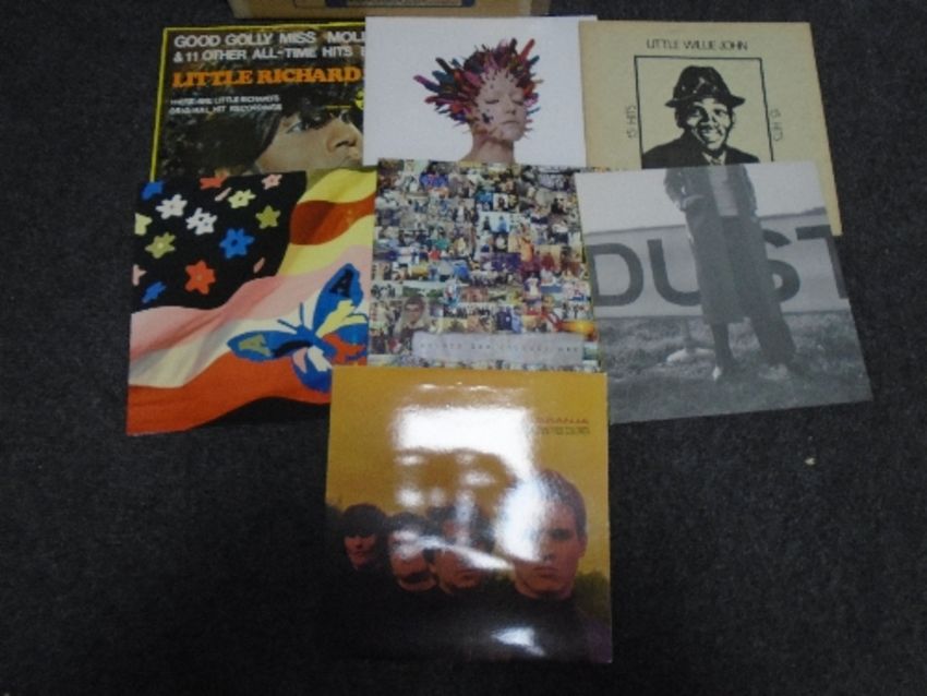 A box containing vinyl records including Little Richard, La Granja, Goldie, Lynyrd Skynyrd, jazz etc.