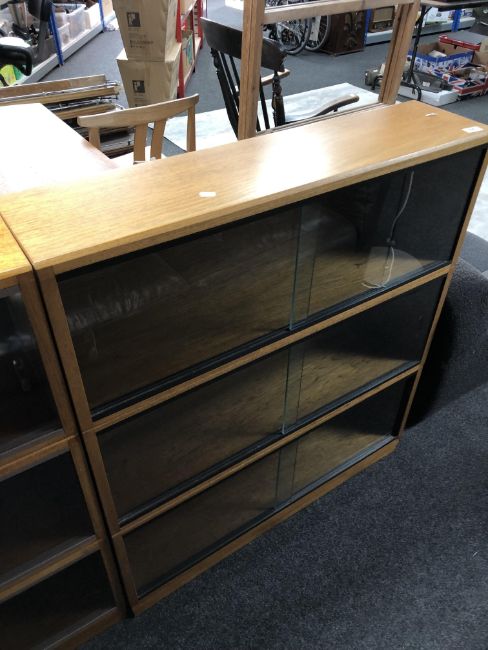 A mid-20th century three tier stacking bookcase with sliding glass doors (width 91.5cm).
