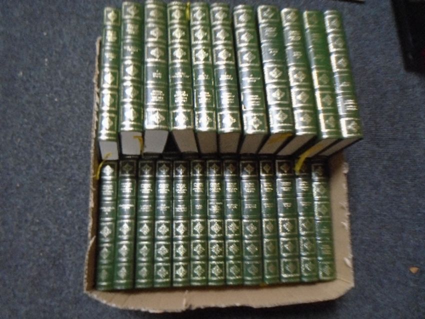 A box containing a quantity of Heron books, leather bound volumes, the works of Charles Dickens.