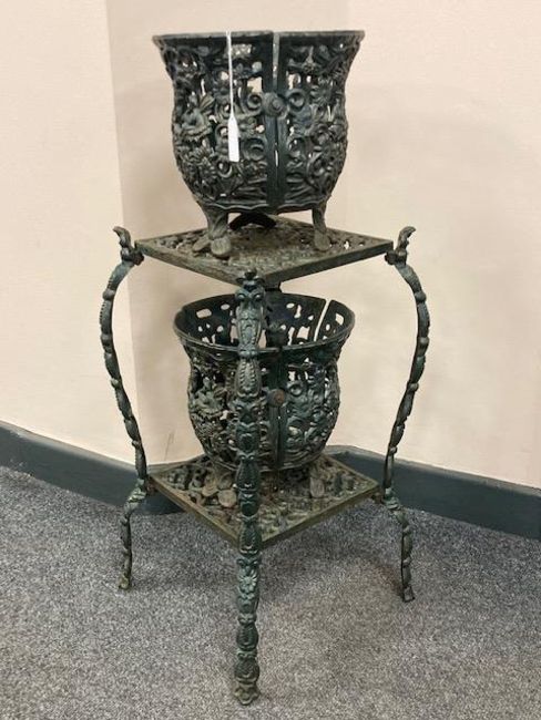 A cast iron two tier plant stand together with two planters (3)